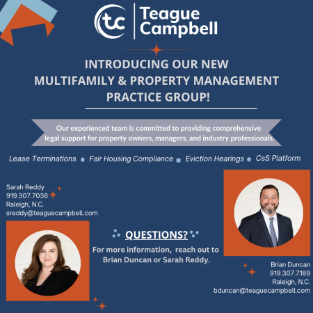We’re excited to introduce Teague Campbell’s new MULTIFAMILY & PROPERTY MANAGEMENT Practice Group! Congratulations to Brian Duncan and Sarah Reddy, Esq. on leading this exciting new initiative!